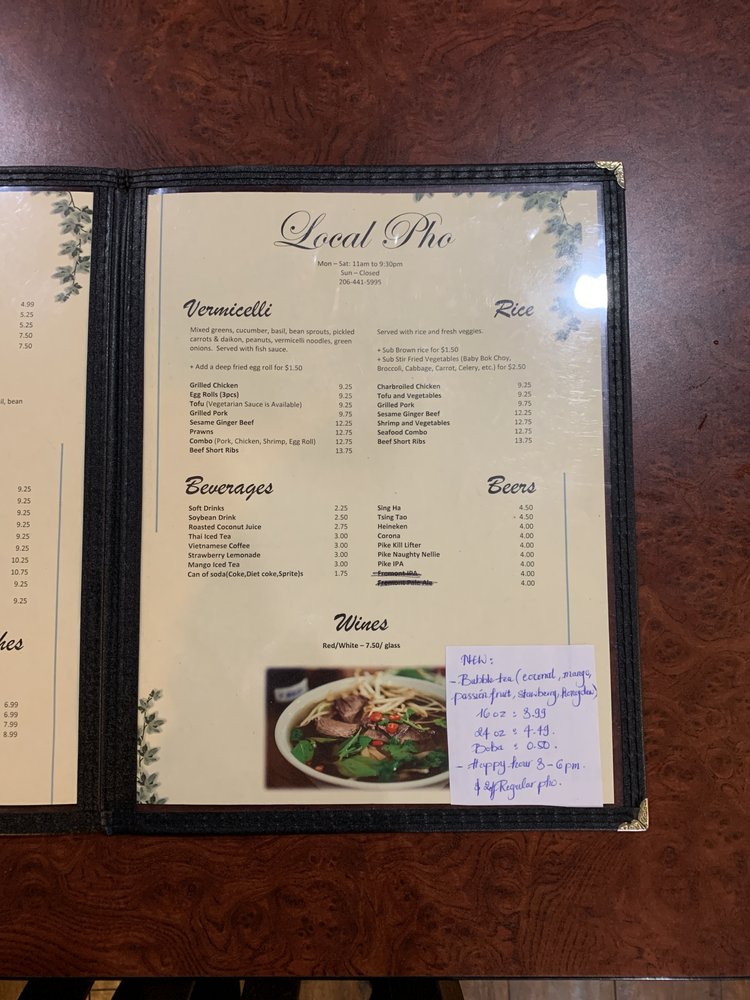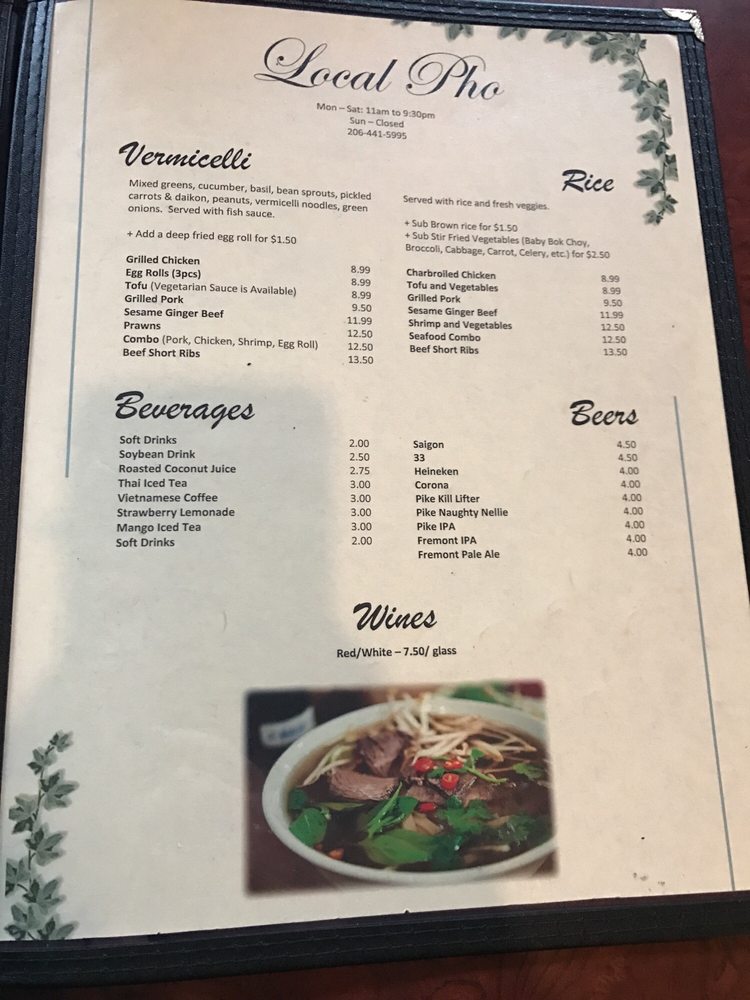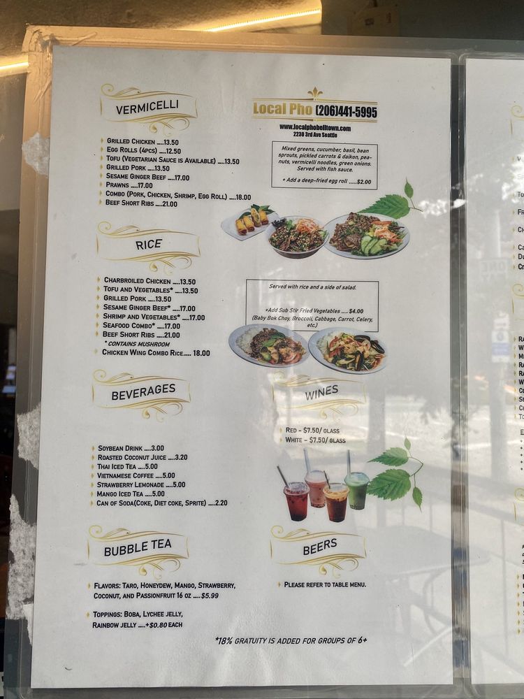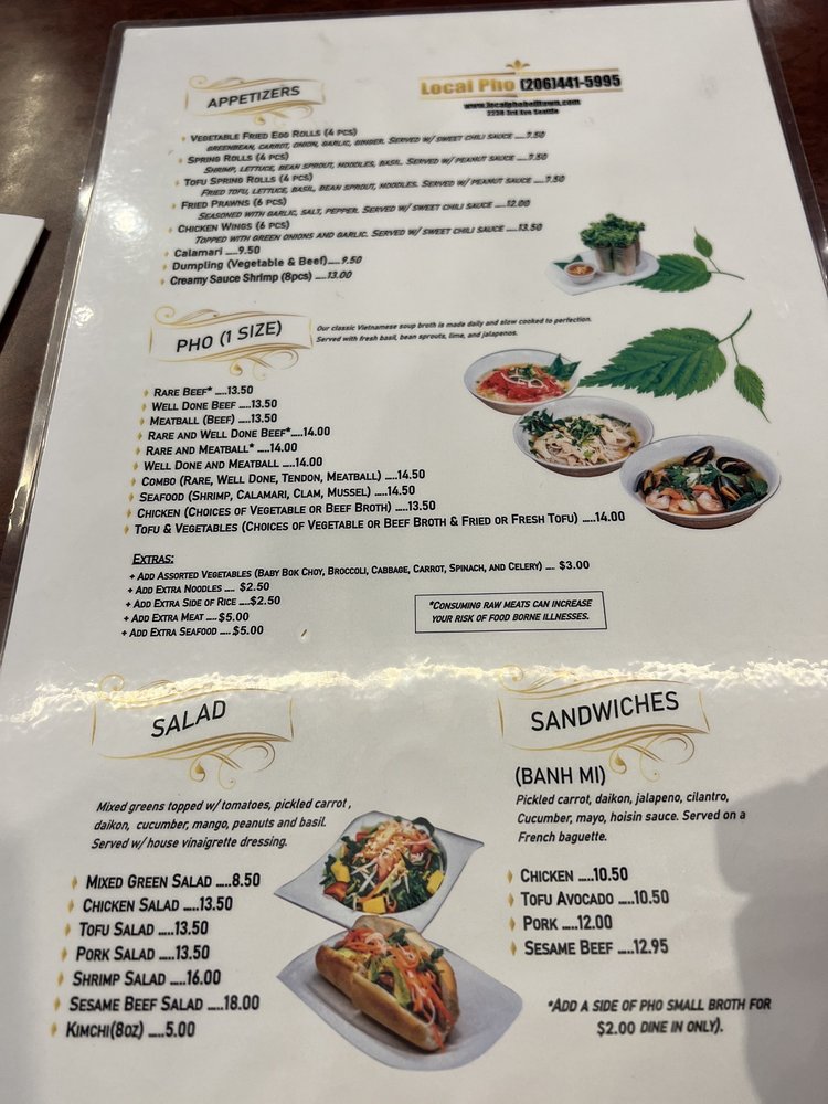 Local Pho, located in Seattle, offers Vietnamese cuisine with a focus on delicious pho dishes. Their menu features a variety of appetizers, salads, and dinner pho options, including Chicken Pho, Combo Pho, and Seafood Pho. Customers rave about the flavorful broth, tender meats, and fresh accompaniments. The cozy ambiance and friendly staff make dining at Local Pho a pleasant experience. With options for both meat lovers and vegetarians alike, this eatery caters to a variety of tastes. Don't miss out on their 3 Piece Fried Egg Roll or refreshing Kimchi salad. Whether you're looking for a quick lunch or a cozy dinner spot, Local Pho is the place to be for a satisfying Vietnamese meal.